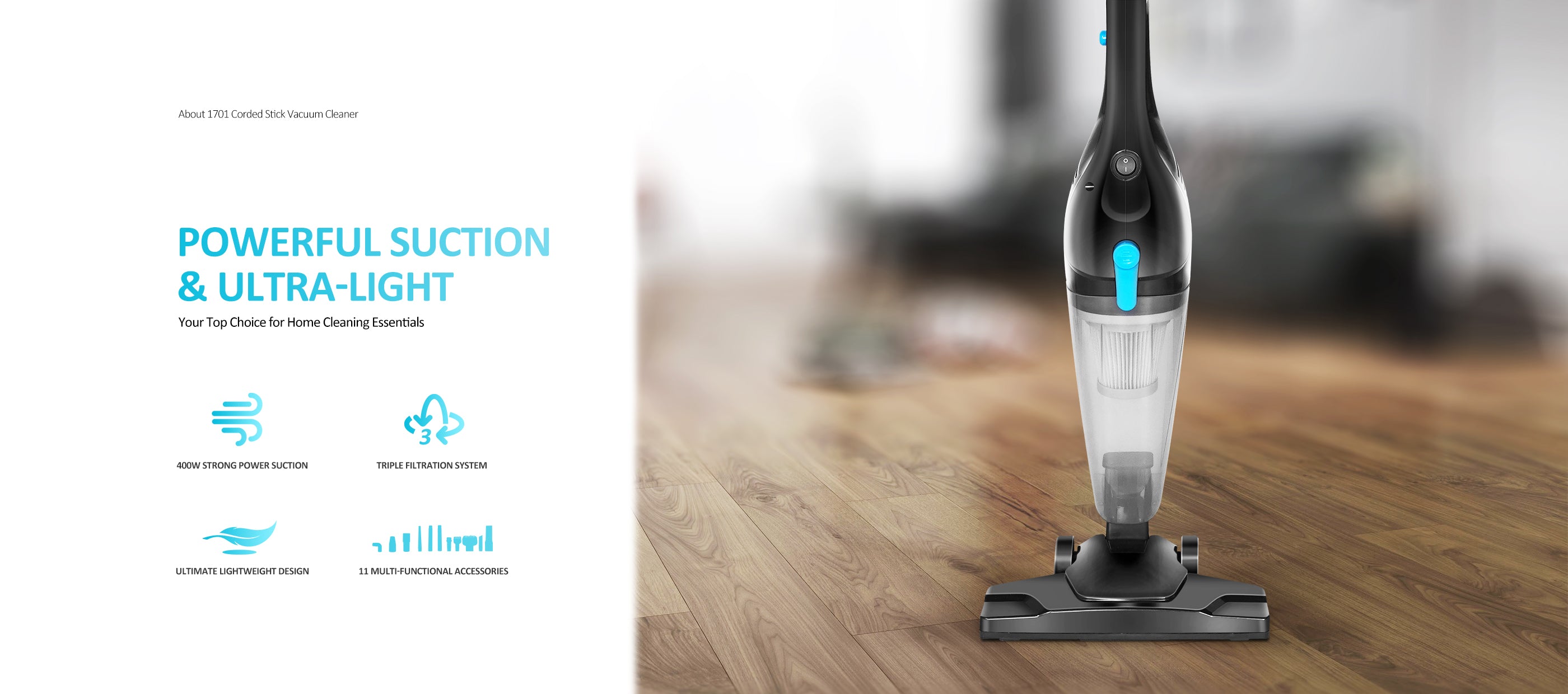 Intercleaner 1701 Black Corded Stick Vacuum Cleaner, 15KPa Powerful Suction with 400W Motor, 12 in 1 Lightweight Bagless Stick Vac with Handheld, Ultra Quiet, for Hardwood Floor Carpet Car Pet Hair