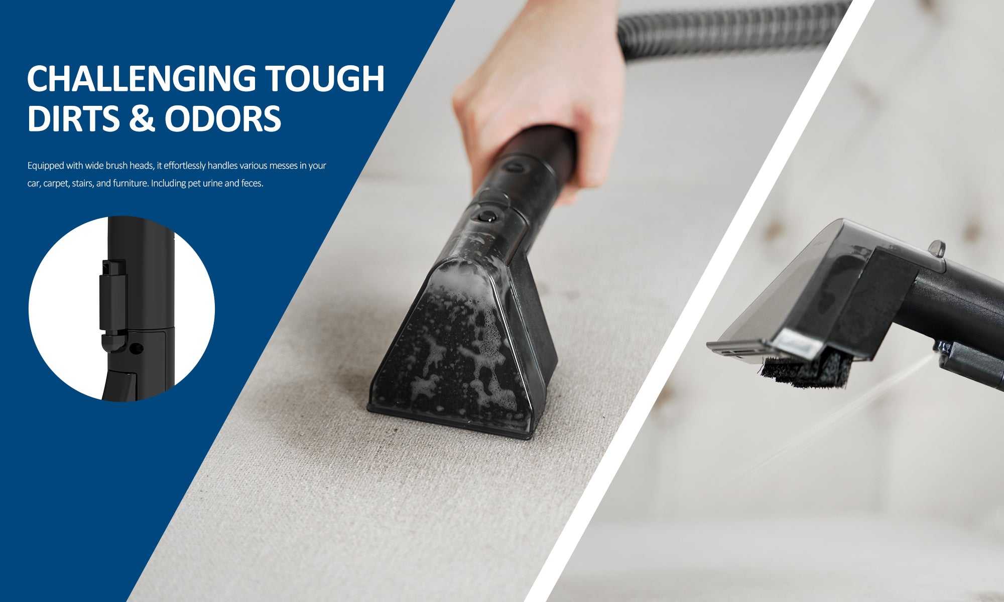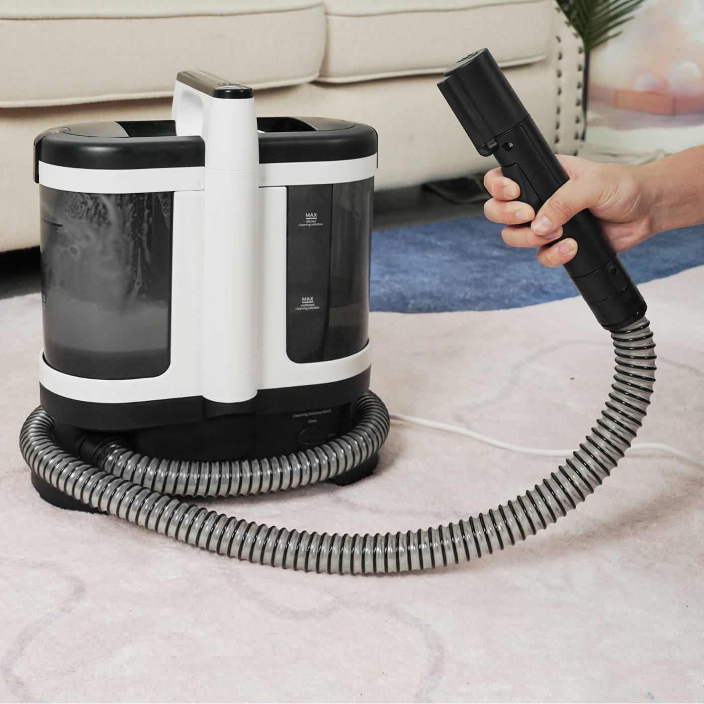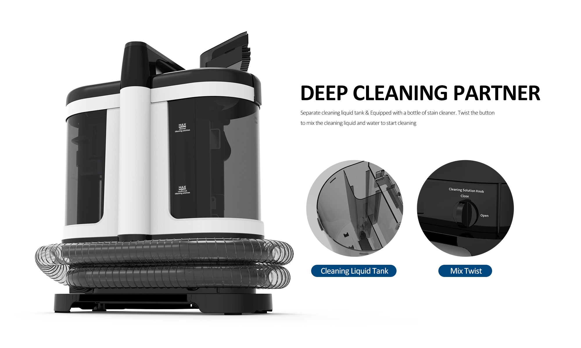 - 【Dedicated Cleaning Liquid Tank】: Features a separate tank for the cleaning solution and comes with a stain cleaner, ensuring precise use of cleaning agents for stubborn stains.